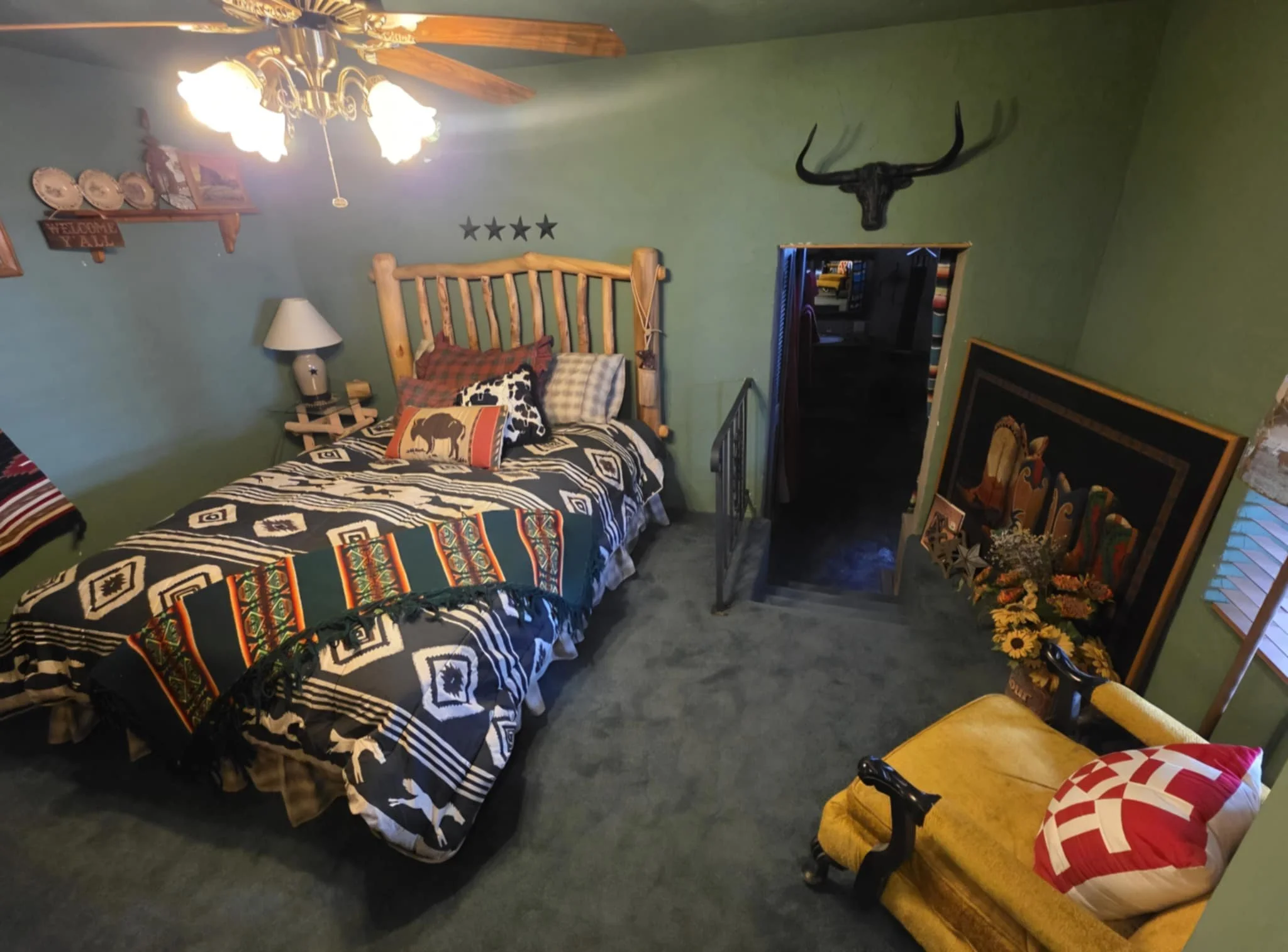 Saddle up for a stay in this one-of-a-kind cowboy-themed room that brings the Wild West to life. This room features a handcrafted bed along with Western decor. But the real surprise? An underground bathroom surrounded by tunnel walls. This former tunnel has been transformed to into a bathroom like no other. The bathroom where the texture of carved tunnel walls meets the rugged allure of a corrugated metal shower. This room creates a memorable stay and has proof of the history behind the house itself.