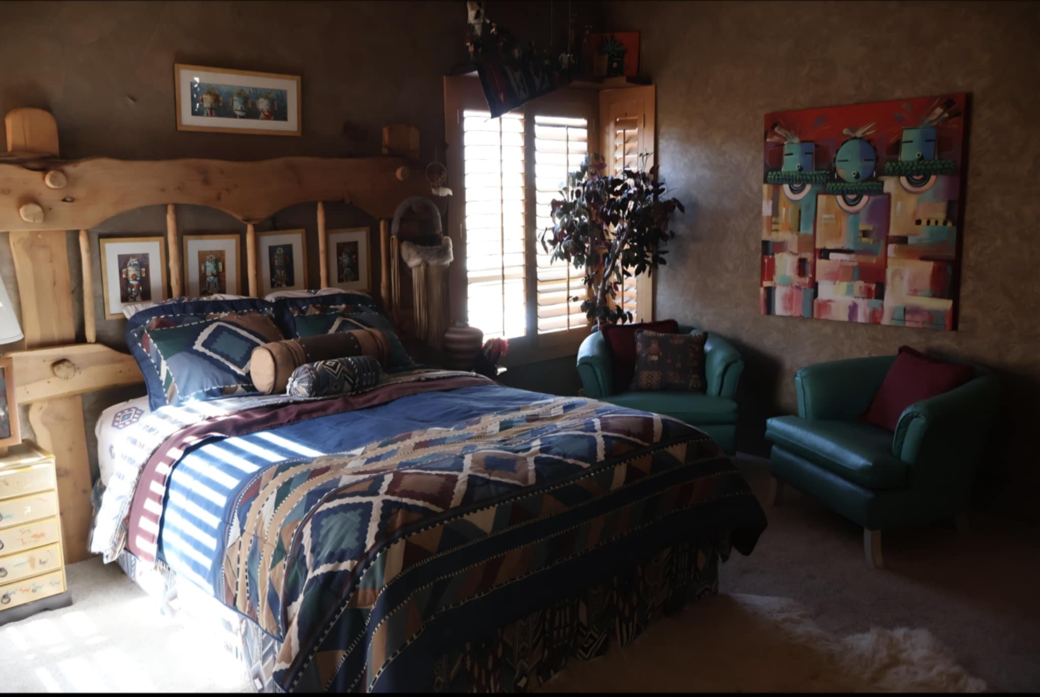 Inspired by Richard Gorman, who was born in Keams Canyon, Arizona on the reservation. He is a member of the Hopi Tribe. Richard enlisted in the U.S Army where he started his artwork painting on armored tanks and creating murals. He also took on a personal interest in woodcarving. He has won many awards throughout the years. This room displays his many forms of art. He shares his culture in each piece of art, and not only do you see it, but you also feel it throughout the whole room. Attached to the room is a unique Native American styled bathroom. We bring a part of Gorman's Hopi culture to you!